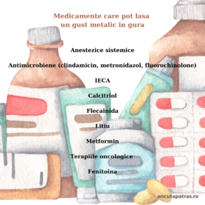 3.Un gust amar sau metalic în gură poate fi o experiență neplăcută asociată cu utilizarea anumitor medicamente. De exemplu, persoanele care iau metformină, un tratament comun pentru diabet, raportează adesea un gust metalic persistent. Cercetările sugerează că acest fenomen apare deoarece metformina este eliminată parțial prin salivă, iar gustul poate persista atâta timp cât medicamentul este activ în organism. Alte medicamente cunoscute pentru acest efect includ antibiotice (precum metronidazolul), medicamente pentru chimioterapie și radioterapie, tratamente pentru tiroidă, stabilizatori de dispoziție precum litiul, și chiar antivirale utilizate în tratamentul COVID-19, cum ar fi Paxlovid. În plus, anumite medicamente, cum ar fi anticolinergicele, pot provoca uscăciunea gurii, ceea ce poate accentua senzația unui gust metalic. Acest efect secundar poate varia ca intensitate de la o persoană la alta, dar este important de reținut că de obicei dispare odată cu întreruperea tratamentului sau după ce organismul se adaptează.